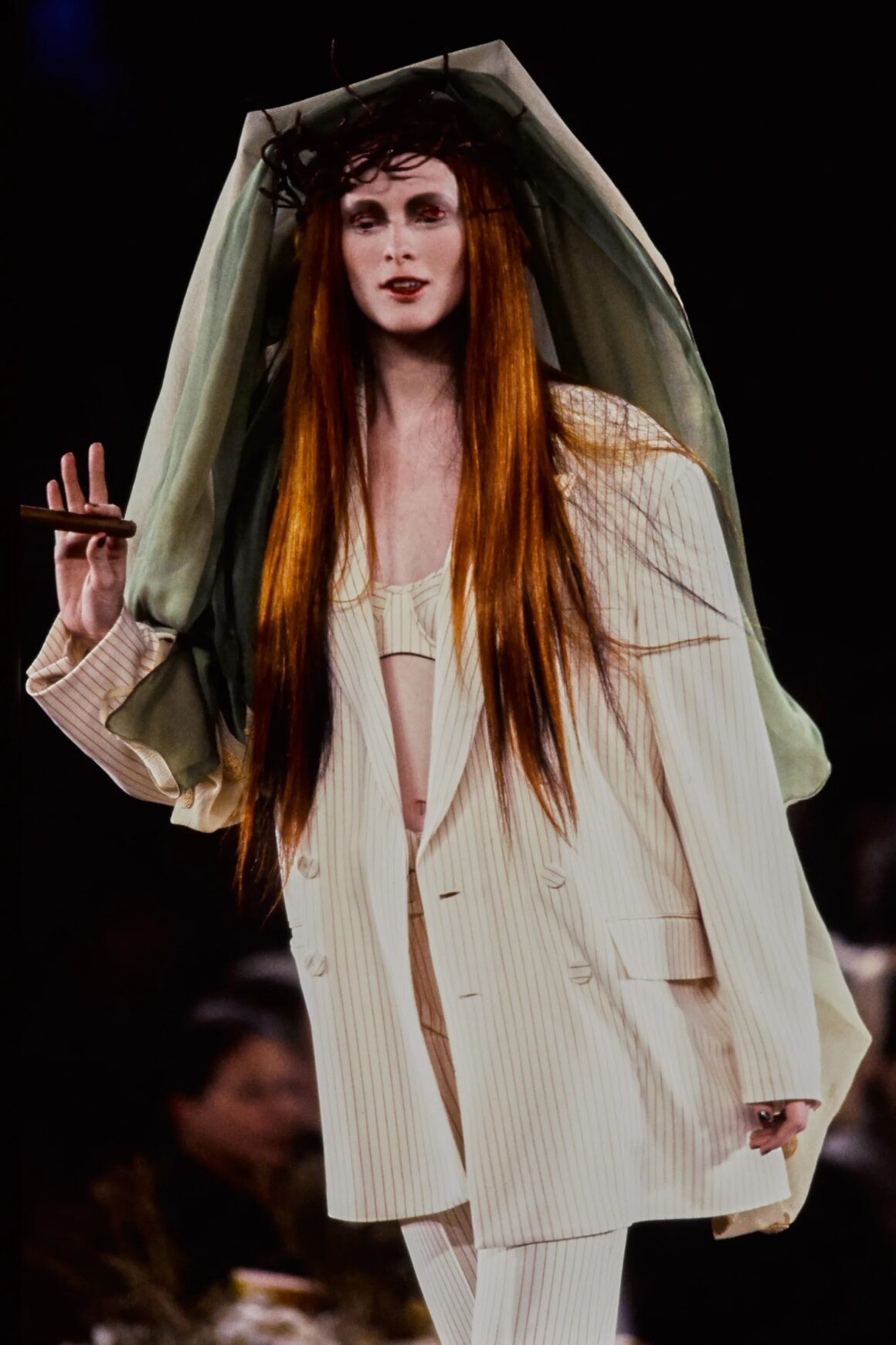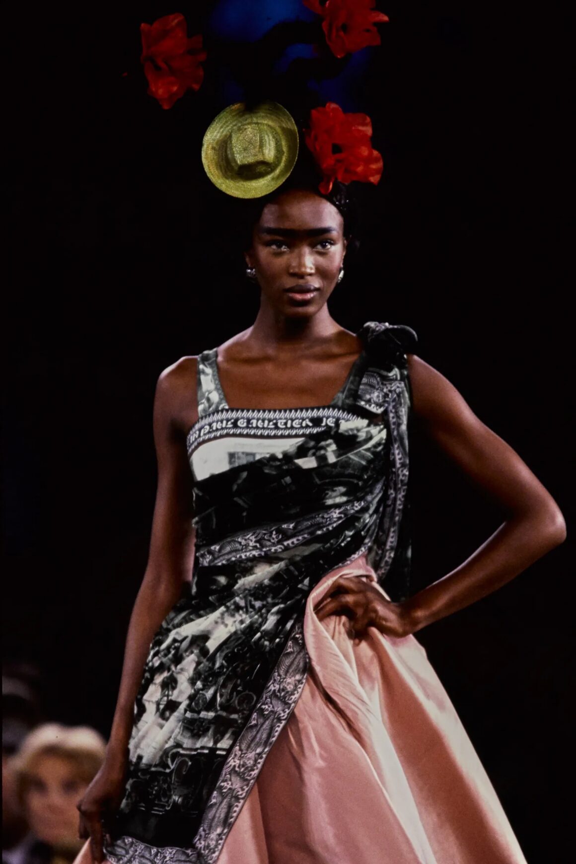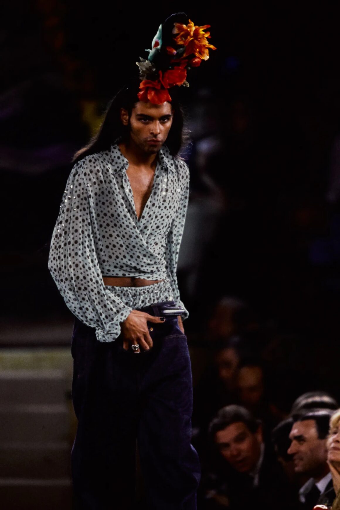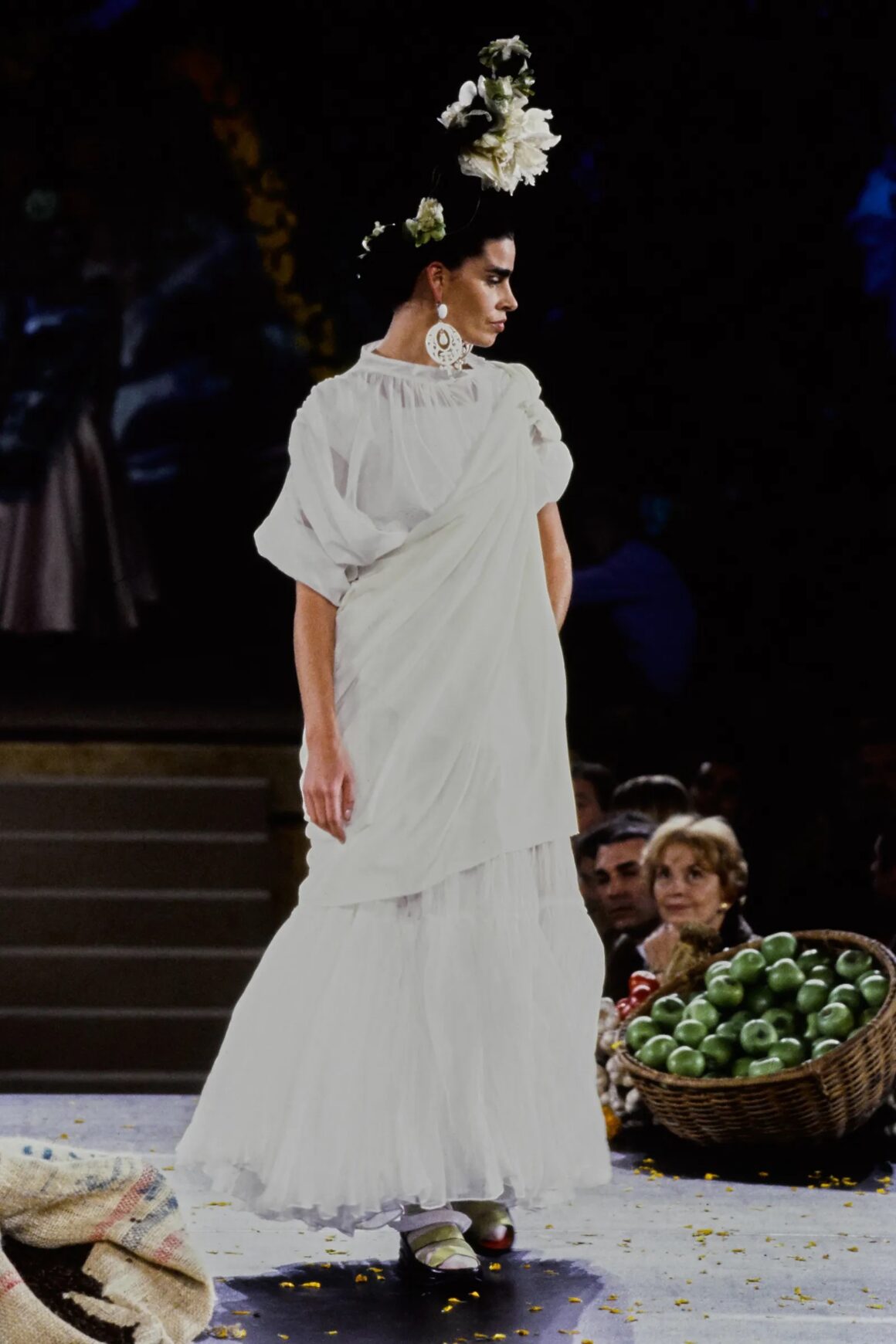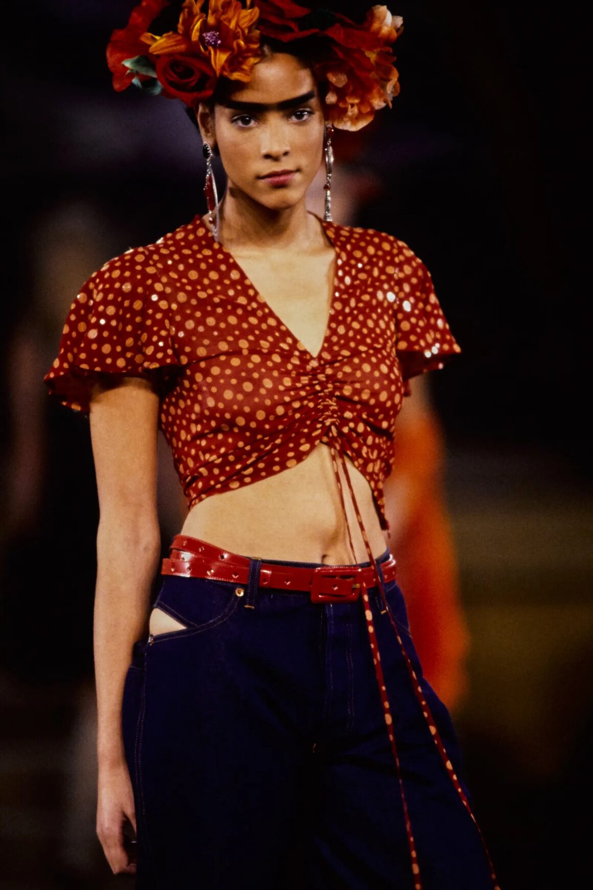 With his makeup and hair choices, Gaultier paid homage to both Kahlo’s distinct physical appearance in her self-portraits and the whimsical nature of her landscapes. In terms of the former, he sent several models down the runway with dark, thick brows and, on a few occasions, even a unibrow. Others donned deep red lipstick and significant black smokey eyes. This stood in direct contrast to the ultra-thin brows, nude lips, and minimal eye makeup that dominated the aesthetics of the decade.