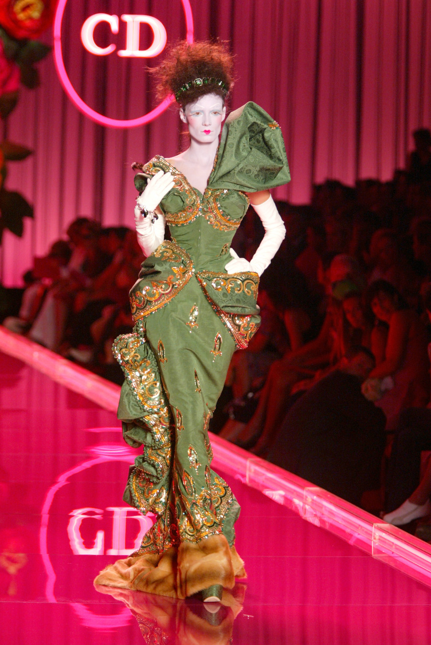 In paying homage to the famed empress, Galliano leaned into the opulence of the 19th-century Viennese court. The gowns featured massive skirt flounces and extreme ornamentation, being adorned with heavy crystal embellishments, gilded hand-painted details, and fluffy furs.