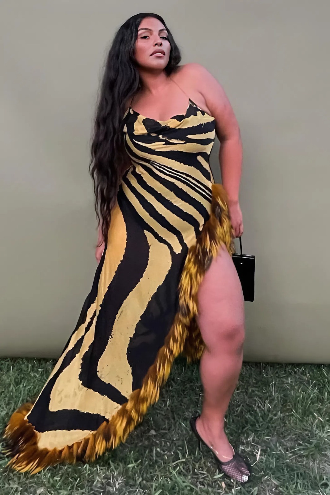 At just 21, Aaliyah was already a certified icon in both music and style. She brought something entirely fresh to the red carpet: a look that was sensual but self-assured, playful but powerful. Cavalli’s wild print—a tiger-stripe pattern in yellow and black—became a fashion flashpoint, a symbol of turn-of-the-century glamour fused with untamed confidence.