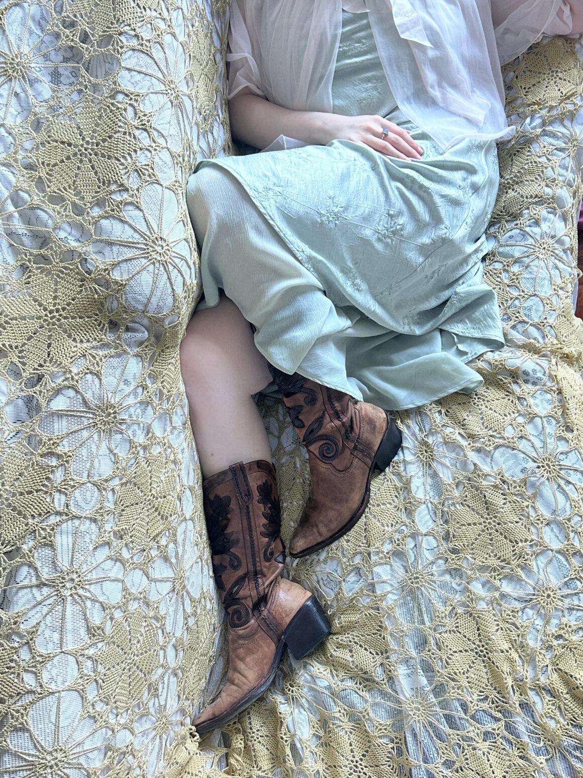 At 25, I decided to quit drinking, and with that, I headed home to regroup and repair – momentarily. What signifies a change of direction more than a pivot in footwear? I headed to the self-proclaimed Mick Jagger of Johannesburg, Fundi Leather, where I found my first pair of 1970s cowboy boots, and at once, cocktails were out and cowgirl was in. I spent a summer pairing them with various vintage nightgowns I found at charity stores, whilst repeatedly trying to confirm to my family that I was doing great.