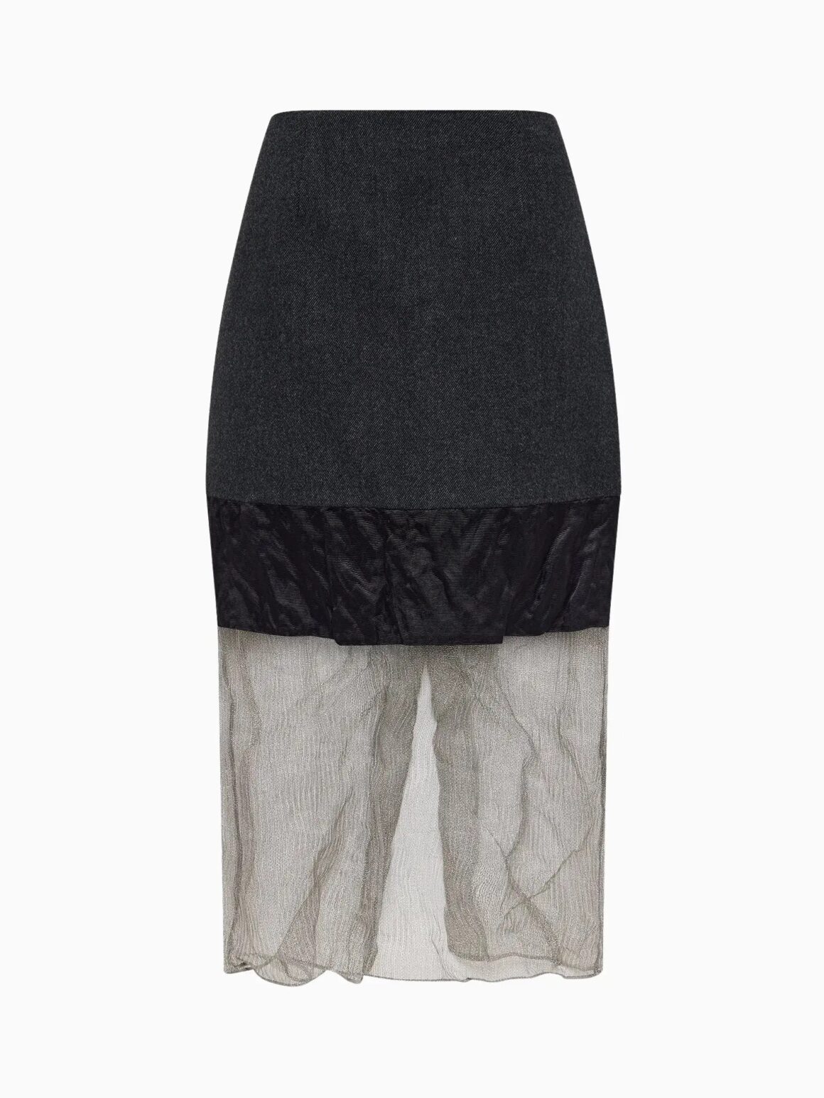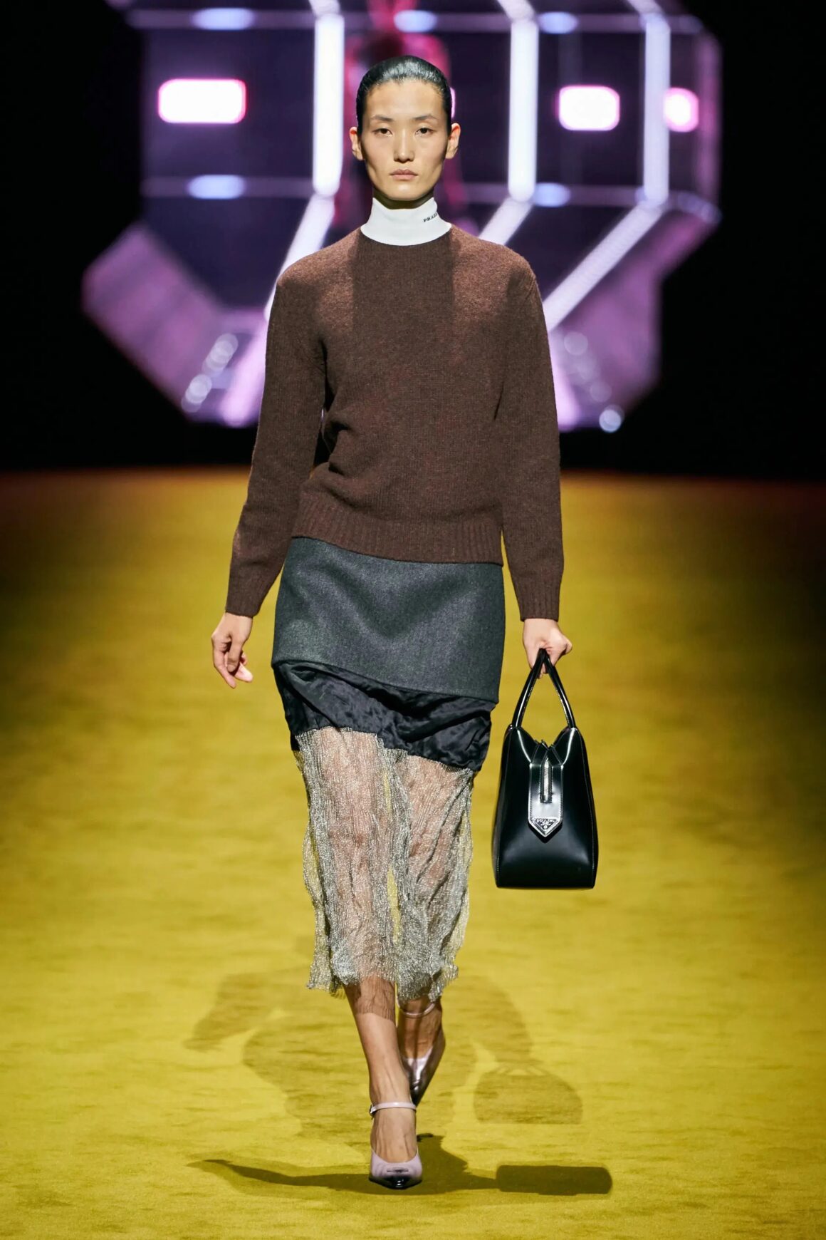 Miuccia Prada and Raf Simons’ 2022 spring collection was one for the ages. To capture this impeccable collection, Prada and Simons looked in the Prada rearview mirror for inspiration. “There are never direct recreations, but there is a reflection of something you know, a language of Prada,” shared Simmons in a statement. Case in point, the strategic mix of wool, silk, and fishnet that gives this anything-but-basic tailored skirt a striking effect.