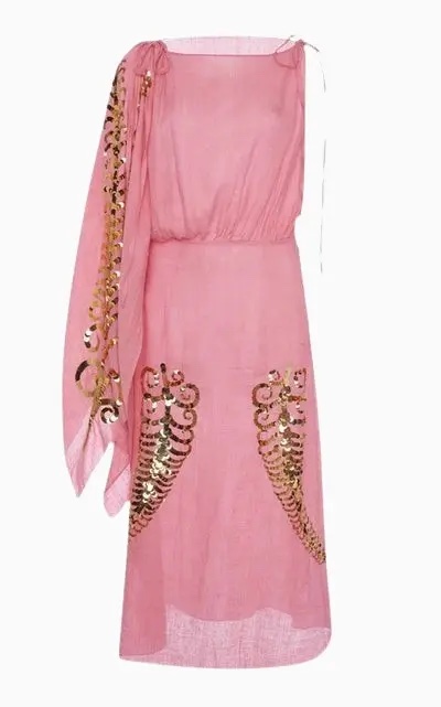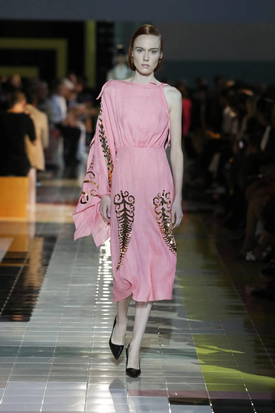 Referencing styles from previous decades is nothing new when it comes to designer collections. Miuccia Prada’s genius is the ability to take certain style hints from the past and infuse them into dreamy looks. One of the runway standout pieces from her Spring 2020 collection was definitely this glorious pink midi dress. You’ll notice a 1970s influence in the draping of this ultra-chic piece, and a sequin leaf appliqué showcases a reflective design, adding to its already stunning look.