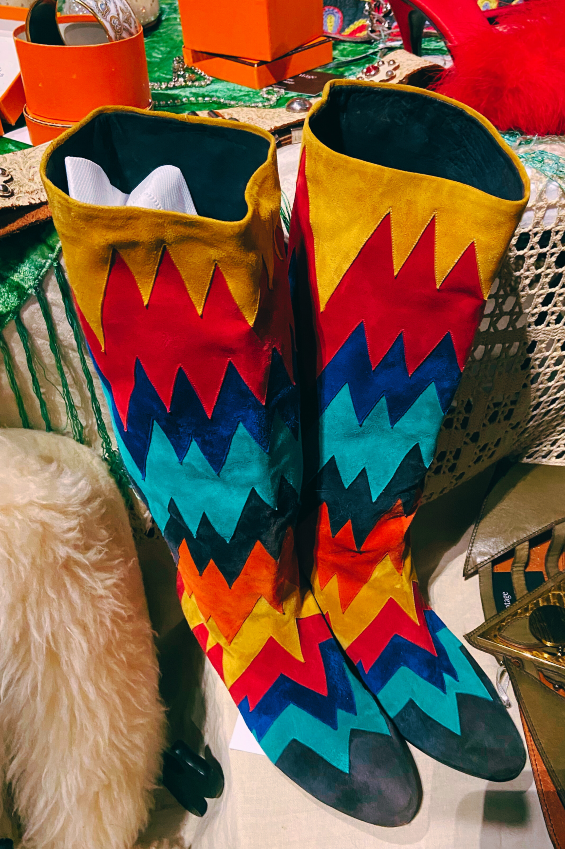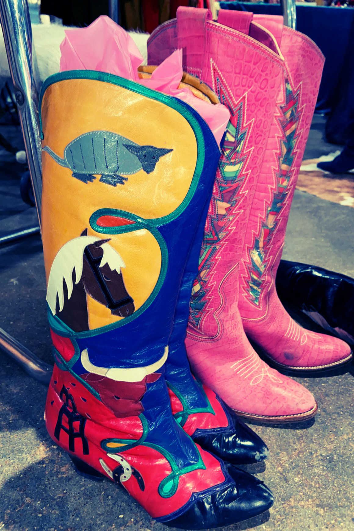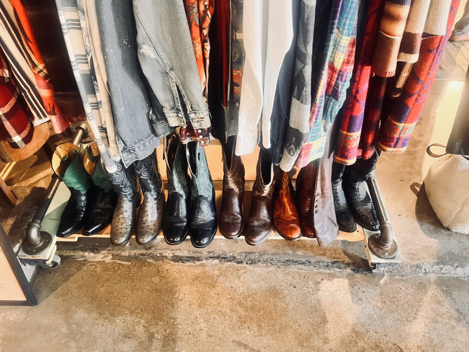 Go big or go back to the rack. The floor delivered showpiece boots that read part Western, part glam-rock. These are the kind of boots that do the whole outfit for you. Let them headline and keep everything else pared back.