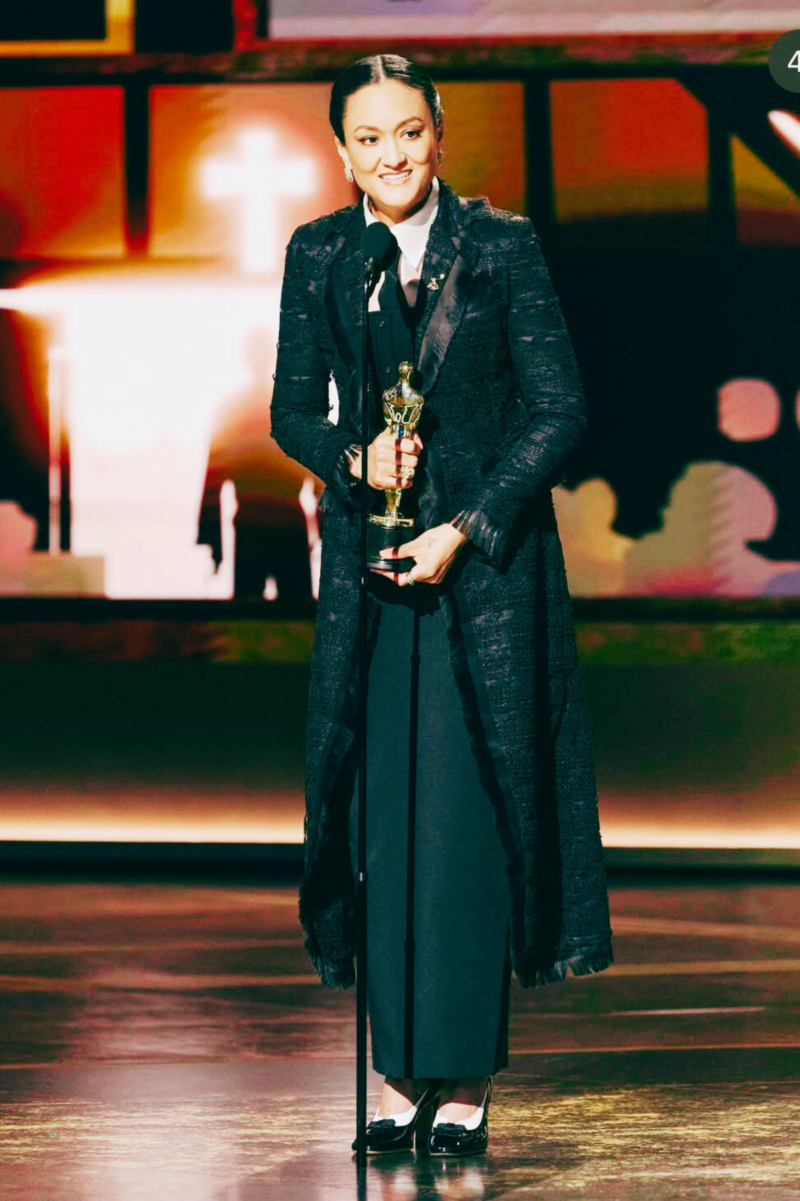 Some Oscars look sparkle, and some signal. Autumn Durald Akrapaw’s moment did both, taking home Best Cinematography for Sinners and making history in the process. And then came her wardrobe: Thom Browne tailoring with a steady, self-possessed energy – equal parts ceremony and control, anchored by a gorgeous full-length coat pulled from the house’s Fall 2015 collection.