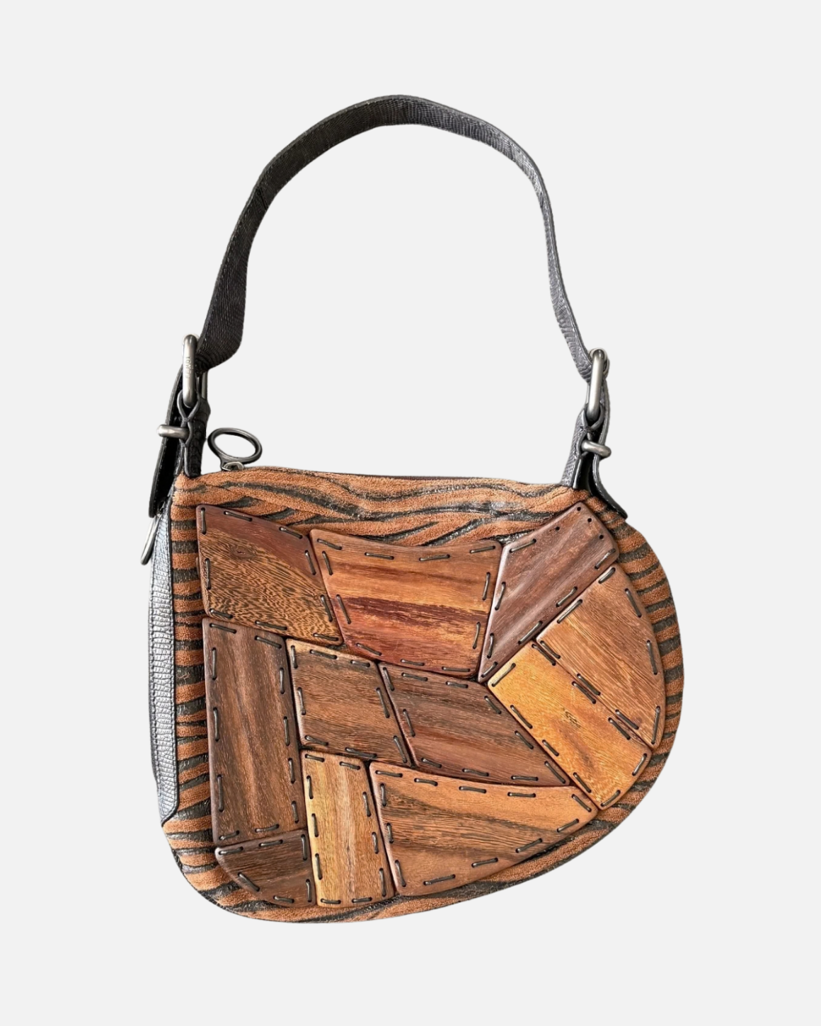 Designed by Silvia Venturini Fendi for the Spring/Summer 2002 collection, the Oyster was undoubtedly a hit. It appeared in several magazines that same year and was admired for its distinct curved shape and the broad range of colors, materials, and patterns. One version came covered in chunky, yet incredibly chic wood panelling. A statement piece for sure, the Oyster is a bag with undeniable personality and a distinct artistic identity.